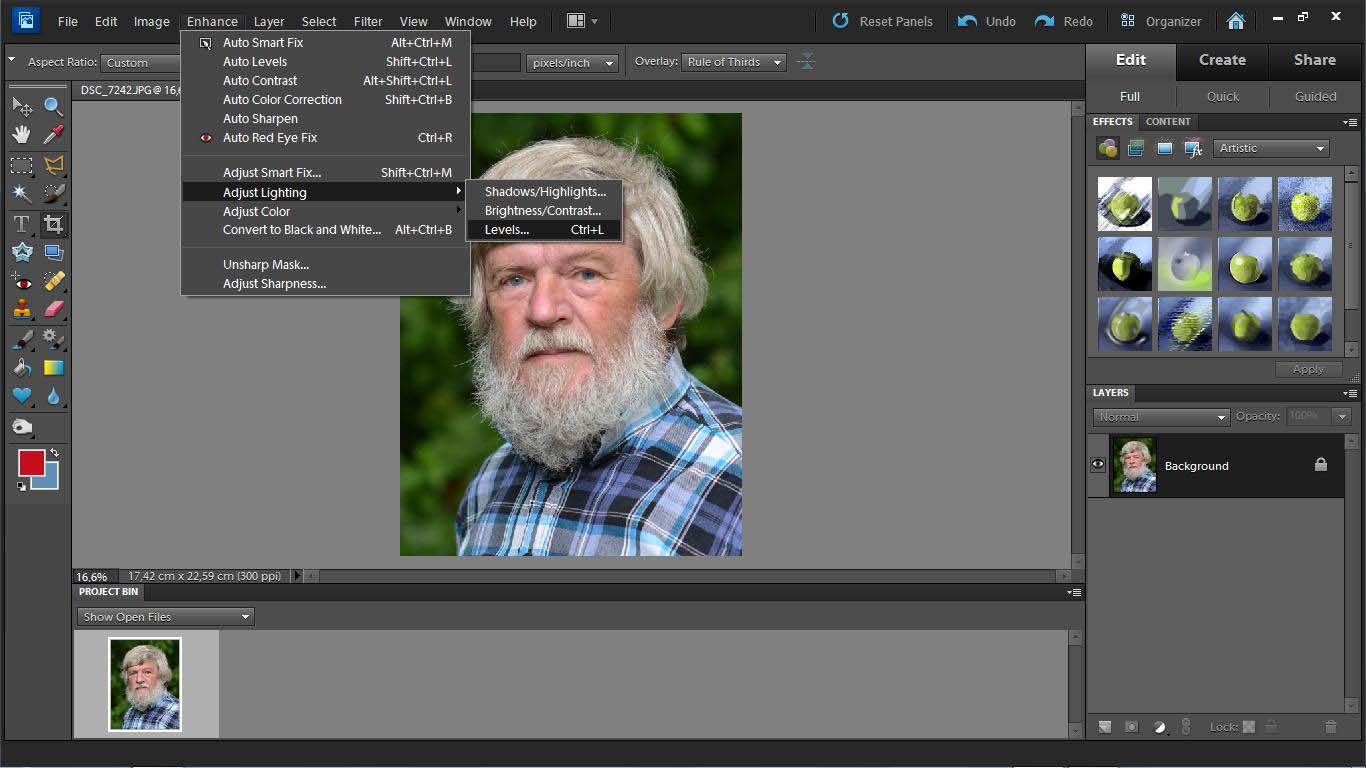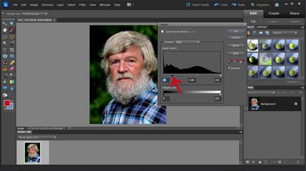 Efter at et billede er blevet åbnet vælges Enhance - Adjust Lighting - Levels