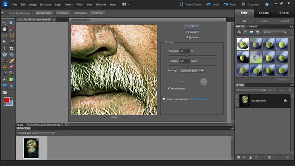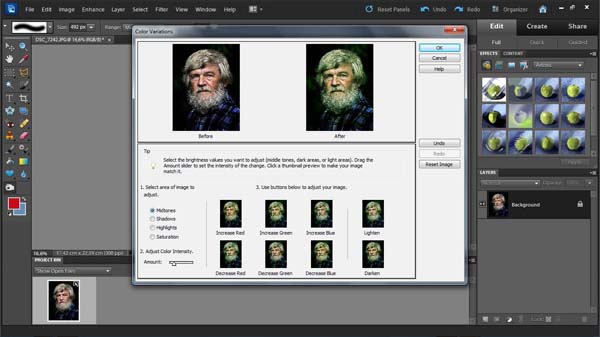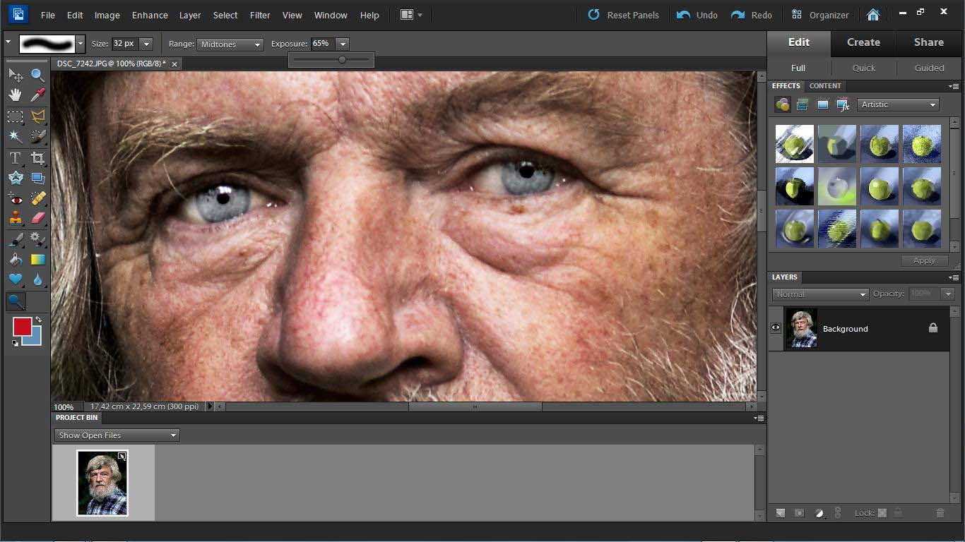 Burn værktøjet vælges og skyggepartier i ansigtet og baaggrund gøres mørkere.