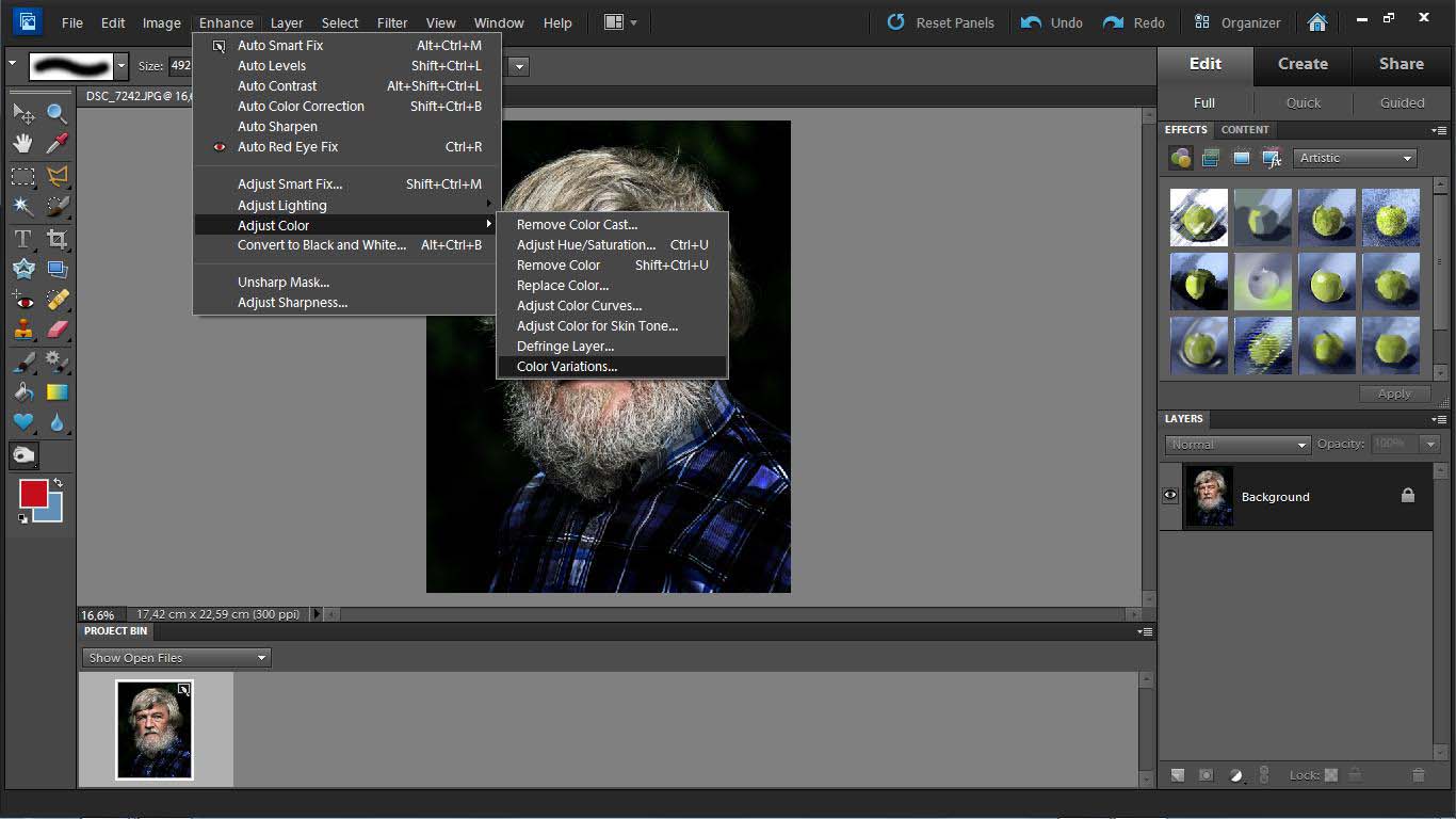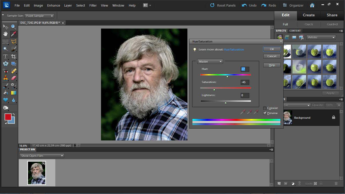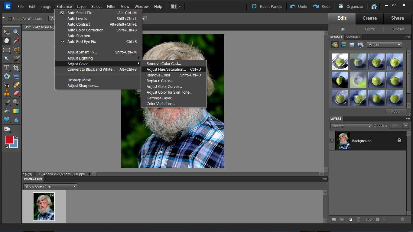 Der vælges EnhanceAdjust Color - Adjust Hue/Saturation.