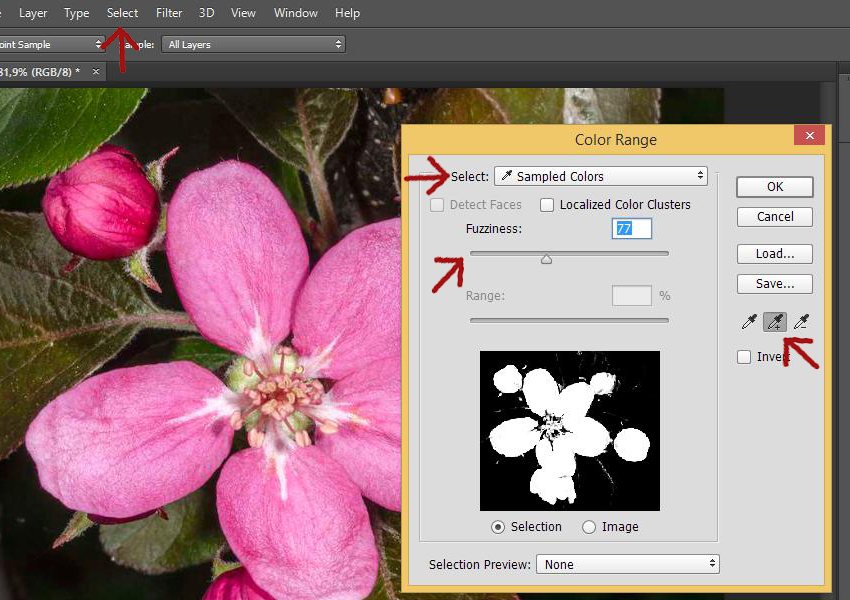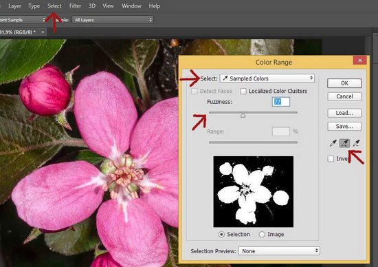 Like Magic Wand, Color Range makes selections based on colors. With the options set as shown with the red arrows, You can make a selection around the red flowers. |