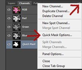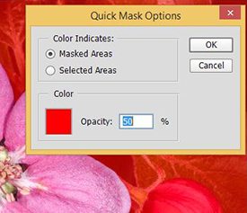 The default color for the masked array are red with 50% opacity. You can change the color in Quick Mask Option in the Channel palette. |