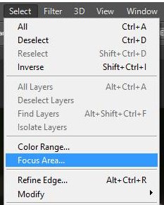 You find the Focus Area command here betveen Color Range and Refine Edge.