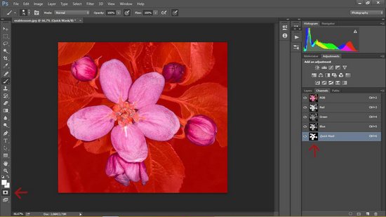 You'll find the Quick Mask tool in the Tools palette. When You click on the Quick Mask tool, You create a mask in the Channel Palette. You can use a Pensel tool to paint the mask. If You paint with white the array will be selected, if You paint with black the array are masked and are not selected. You can paint with grades of gray and the array are partially selected. Click again on the Quick Mask tool, and You will see the selected array as marching ants. |